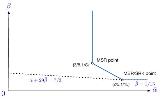 While the outer bound (12) is known [23,24,30], the outer bound (13) is new. Figure 2 shows the optimal trade-off curve between the normalized storage-capacity and repair-bandwidth for the SRC problem. Notice that, for this example, the SRK point is, in fact, the MBR point even though the trade-off region has two corner points. In the same figure, the outer bunds (12) and (13) have also been plotted. As illustrated, when set as equalities, they intersect precisely at the MBR/SRK point . Notice that for this example at least, the outer bound (13) is tight only at the MBR/SRK point.