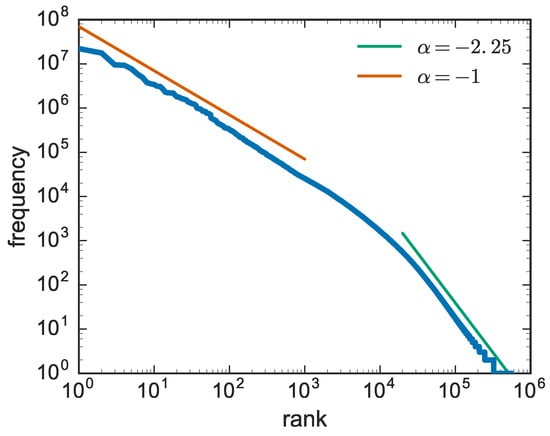 - Piantadosi, S.T. Zipf’s word frequency law in natural language: A critical review and future directions. Psychon. Bull. Rev. 2014, 21, 1112–1130. [Google Scholar] [CrossRef] [PubMed]