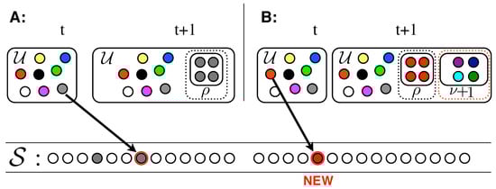 Urn model with triggering. (A) An element that had previously been drawn from the urn, is drawn again: the element is added to and it is put back in the urn along with additional copies of it. (B) An element that never appeared in the sequence is drawn: the element is added to , put back in the urn along with additional copies of it, and brand new and distinct balls are also added to the urn.