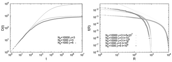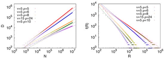 Results for the multicolors Pólya urn model without innovation. Results are reported both from simulations of the process (points) and from the analytical predictions (straight lines), for different values of the initial number of balls and of the reinforcement parameter . Left: Number of different colors added in the sequence as a function of the total number t of extracted balls. The curves from analytical predictions of Equation (23) exactly overlap the simulated points. Right: Frequency-rank distribution. Simulations of the process are here reported along with both: (i) the prediction obtained by inverting the relation ; (ii) the asymptotic solution, valid for , obtained by inverting Equation (23) (refer to [30] for their derivation).
