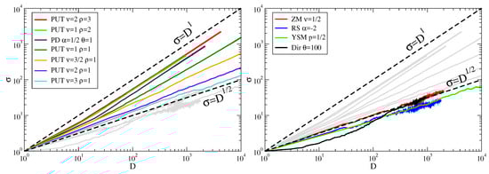 For the Poisson-Dirichlet and the Dirichlet processes, analytical solutions can be computed for the moments of the probability distribution [13,42], yielding the asymptotic exponents respectively 1 and in the Taylor’s law. Numerical results are given in Figure 6. Note that a non trivial exponent in the Taylor’s law is featured by the Poisson-Dirichlet process, where the probability of a novelty to occur does depend on the number of previous novelties, while the Dirichlet process lacks both properties.