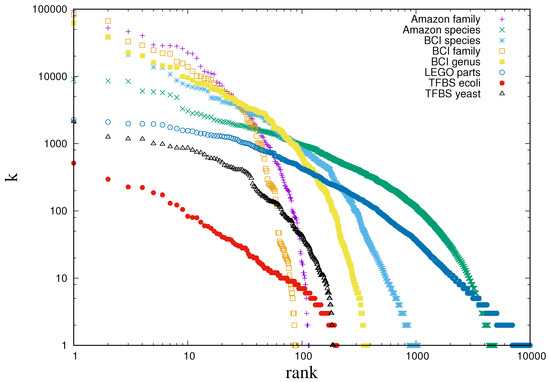 Rank plot of the frequencies across a broad range of datasets. Log-log plots of rank versus frequency from diverse datasets: survey of 4962 species of trees across 116 families sampled from the Amazonian lowlands [12], survey of 1053 species of trees across 376 genera and 89 families sampled across a 50 hectare plot in the Barro Colorado Island (BCI), Panama [13], counts indicating the inclusion of each 13,001 LEGO parts on 2613 distributed toy sets [14,15] and the number of genes that are regulated by each of the 203 transcription factors (TFs) in E. coli [16] and 188 TFs in S. cerevisiae (yeast) [17] through binding with transcription factor binding sites (TFBS).