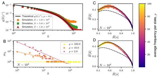 This means that the NML is, to a good approximation, equivalent to S independent draws from the distribution or, equivalently, that the distribution is the one that characterizes typical samples. This is fully confirmed by Figure 2A, which compares with the empirical distribution of drawn from . For large k, we find , which shows that the distribution of frequencies is broad, with a cutoff at . This underlying broad distribution is confirmed by Figure 2B which shows the dependence of the degeneracy with the frequency k.