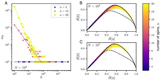 Properties of typical samples for the NML codes of the paramagnet. (A) Plots showing the degeneracy, , of the frequencies, k, in a representative typical sample of length generated from the NML of a paramagnet with different number of independent spins: (blue star), (red cross) and (yellow diamond). The corresponding dashed lines depict the best-fit line. (B,C) Plots of the versus of the typical samples generated from the paramagnet NML code for varying sizes of the data, (B) and (C), and for varying number of spins, n, ranging from 3 to 20. Given N and n, we compute the and over 100 realizations of the NML code of a paramagnet. The results are compared against the and for maximally informative samples (solid black line) and random samples (dashed black line) as described in Figure 2. Note that all the calculated and are normalized by .