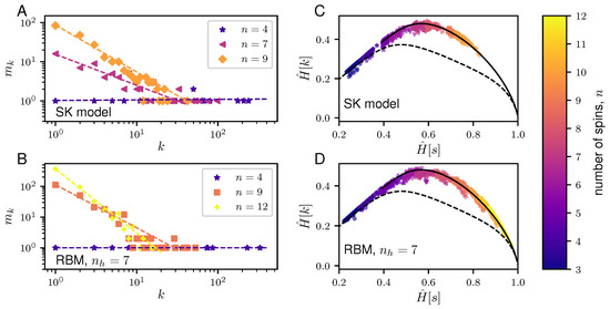 - Starting from the sample, , we calculate the maximum likelihood estimates, , of the parameters of the model, by either solving Equation (41) for the SK model or by Contrastive Divergence (CD) [24,25] for the RBM (see Appendix C.2).