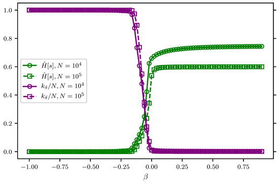 of following the same steps leading to Equation (19), where again z is fixed by the condition . For , we again find, as in Equation (22), that can be considered as independent draws from the same distribution . For , we find that the distribution develops a sharp maximum at indicating that, as mentioned above, the sample concentrates on one state .