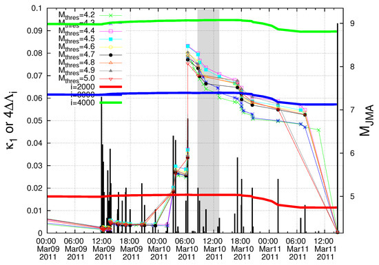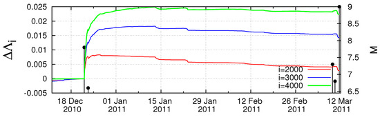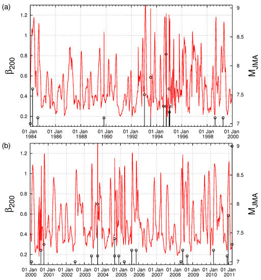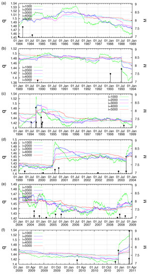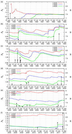 - Varotsos, P.A.; Sarlis, N.V.; Skordas, E.S. Study of the temporal correlations in the magnitude time series before major earthquakes in Japan. J. Geophys. Res. Space Phys. 2014, 119, 9192–9206. [Google Scholar] [CrossRef]