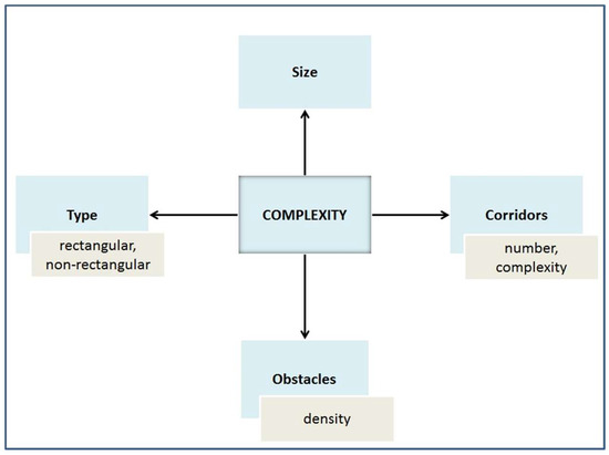 Now, we talk about the complexity of mazes. Note that the complexity measure of a maze M may be different and the measurement of complexity in mazes is a difficult problem [50,51]. Hence, it is of value to be aware of factors affecting the complexity of the maze, as illustrated in Figure 1.