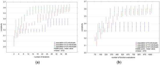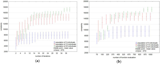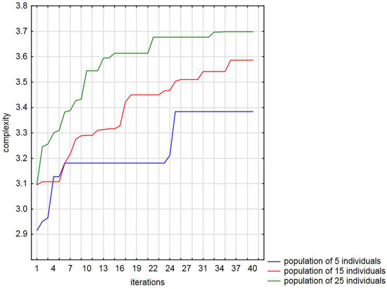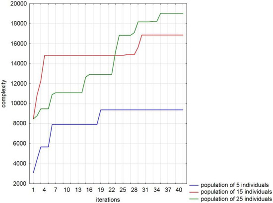 It is clearly visible that for a small population (five individuals in our case), the increase of the number of iterations and so the number of function evaluations leads to a slight improvement in the results obtained. One can see a very small improvement in the average value of complexity for the population size of 15 individuals.