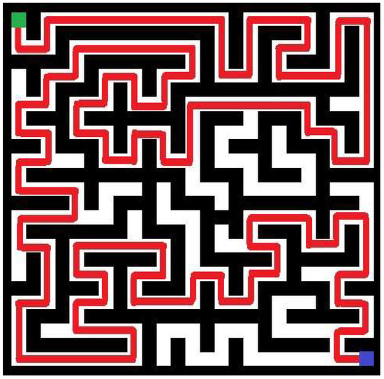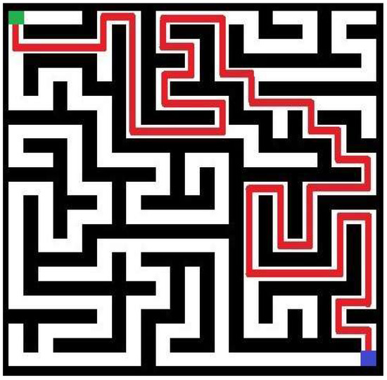 In turn, in Figure 3 above, the best individual in the initial population of an example run of the implemented approach is shown. In this particular trial (the fifth trial in Table 1), a swarm of 15 individuals was employed to generate the more complicated maze of 25-by-25 cells. The maze with the highest value of complexity obtained during 40 iterations in the same run is shown in Figure 4. Referring to Figure 3 and Figure 4, generated mazes have complexities of 8478 and 16,875, respectively (an improvement is equal 99.05%). Note that mazes are shown in terms of blocked (black) and accessible (white) cells. The path for these mazes is marked as red line. Green and blue squares denote the entry and exit points, respectively.