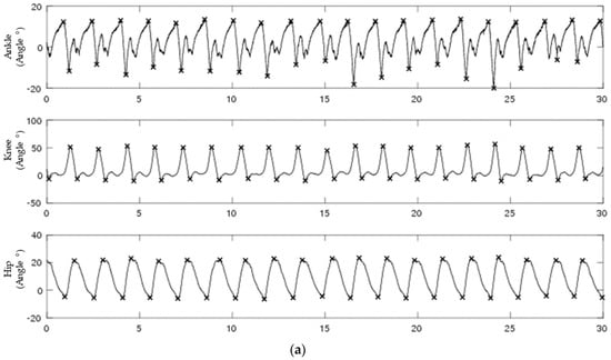 A 30-second segment of biological data for continuous (a) and discrete (b) for ankle (top), knee (middle), and hip (bottom) joint angles. Discrete signals were generated by subtracting peaks from valleys from each continuous joint angle.