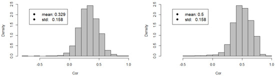 We proceed computing Pearson correlation pairwise for all the time series in our two subsamples. Pearson correlation, , for a pair of time series, and , is defined as [27,30]: