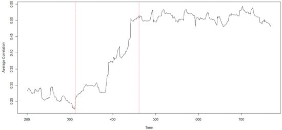 Average cross-correlation among the time series of the NASDAQ-100 components calculated with a moving window of 150 intraday observations. The dashed vertical red lines indicate a window centered around the CA event. Notice the sharp rise of correlations experienced by the stock market around the CA event.