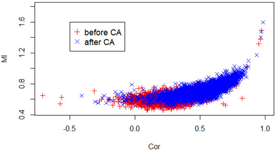 It is also interesting to check the relation between MI and correlation, since it may allow us to spot possible methodological inconsistencies. Figure 9 shows the values of MI versus linear correlation before and after the CA event. MI is non-zero for zero correlations and increases for positive correlations; notice that the points of the scatter plot seem to follow a master curve. This is compatible with findings in similar cases [25]. However, we are not able to fully appreciate the characteristic U-shaped curve, given the absence of strongly negative correlations across the time series of the NASDAQ-100 components. In fact, the assets chosen by the NASDAQ are subject to common risk factors which mitigate the effect of possible sources of negative correlation.