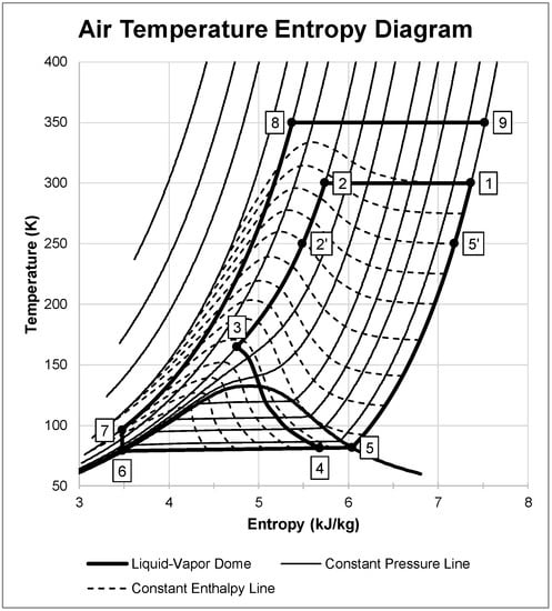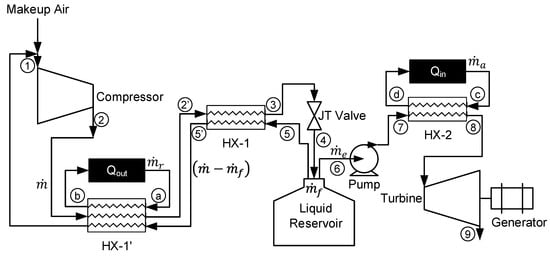 The pre-cooled Linde-Hampson system requires the use of a second heat exchanger (HX-1′) []. There are two cooling streams, stream and the returning air stream. The required for any desired temperature at state 2′ is based on the energy balance of HX-1′ []: