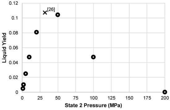 The analysis found that the pressure range for the liquefaction subsystem to produce any liquid yield is 5 MPa to 100 MPa; at 200 MPa, the liquid yield drops to zero. Figure 3 shows the liquid yield for the simple Linde-Hampson subsystem. These results match results found in [,]. The maximum yield point found by Joshi and Patel was 0.107 at a pressure of 32 MPa, which is represented on Figure 3 with an ‘x.’