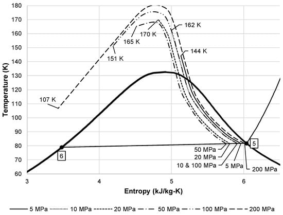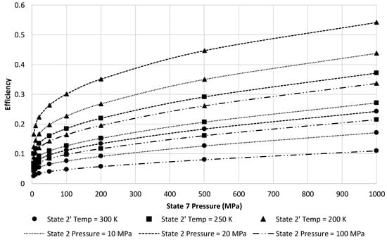 At these factors, the approximate LAES system efficiency at 20 MPa is 18.4%. Increasing the temperature into the turbine inlet increases the energy efficiency of the LAES system. Figure 12 depicts this increase in energy efficiency using a state 2′ temperature of 250 K and state 7 pressure of 100 MPa. Although not depicted in Figure 12, there is a maximum temperature where gains in efficiency would reach an asymptotic limit.