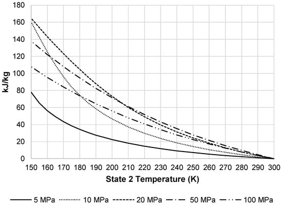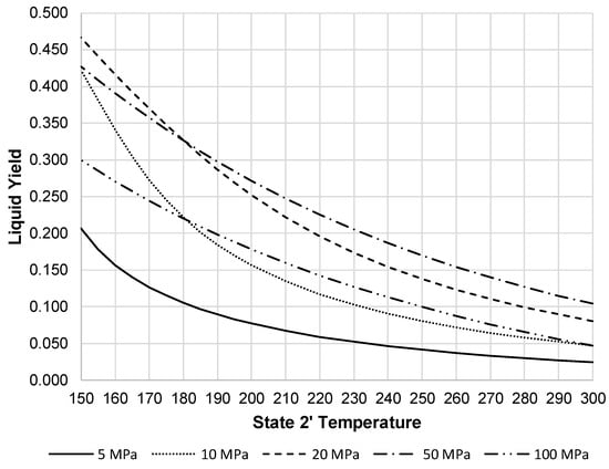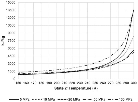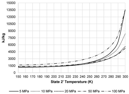 When the liquid increases, this reduces the work required by the compressor on a per unit mass liquefied basis. Figure 7 shows the resulting compressor work per unit mass liquefied for the pre-cooled Linde-Hampson subsystem. This figure shows all pressures begin to converge, except 100 MPa, at a state 2′ temperature around 250 K.