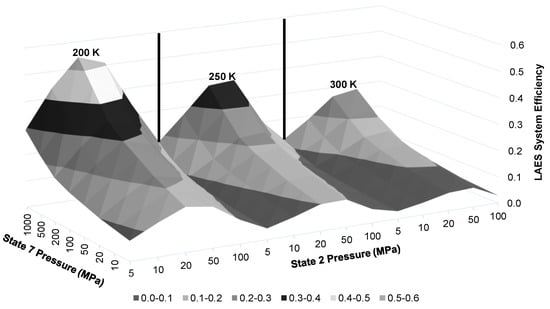 Resulting LAES system energy efficiency with varying state 2 and 7 pressures and three state 2′ temperatures.