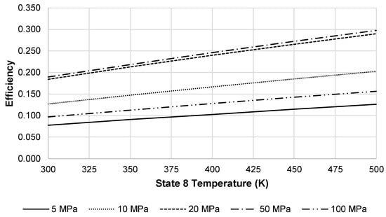 Effects of increasing state 8 temperature on LAES energy efficiency at a state 2′ temperature of 250 K and state 7 pressure of 100 MPa.