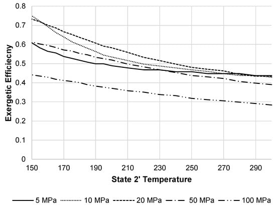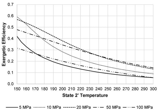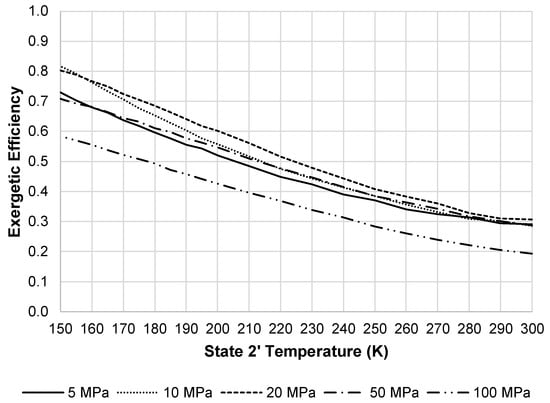 Figure 13 shows the JT valve exergetic efficiency over different state 2 pressures when decreasing the state 2′ temperature. The optimal state 2 pressure in terms of exergetic efficiency for the JT valve is 20 MPa when state 2′ temperatures are below 270 K.