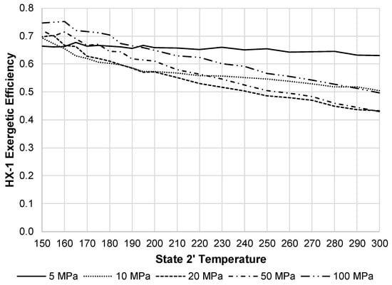HX-1 exergetic efficiency with varying state 2 pressures and state 2′ temperatures.