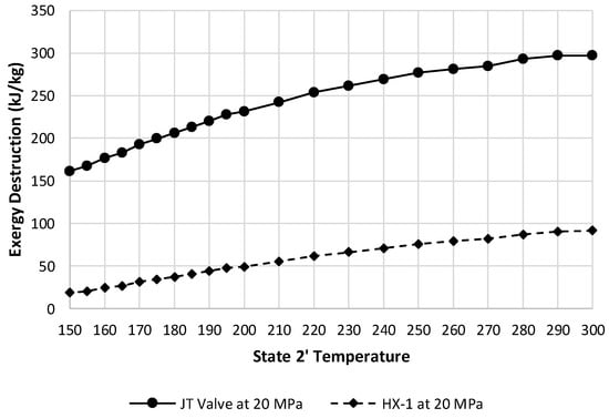 Exergy destruction comparison of the JT valve and HX-1 at a state 2 pressure of 20 MPa over varying state 2′ temperatures.