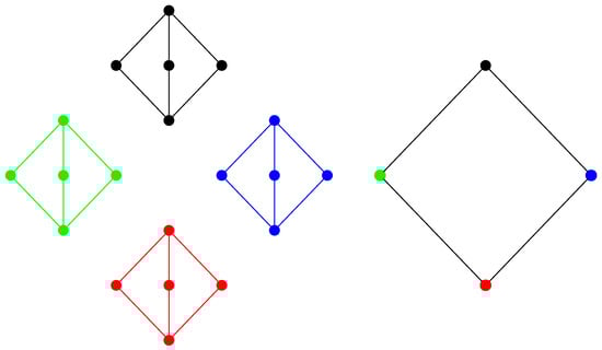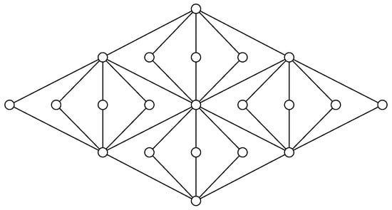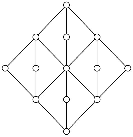 A modular planar lattice will also contain blocks of the type . Therefore, a modular planar lattice can be obtained from a distributive planar lattice by adding double irreducible elements [], as illustrated in Figure 6.