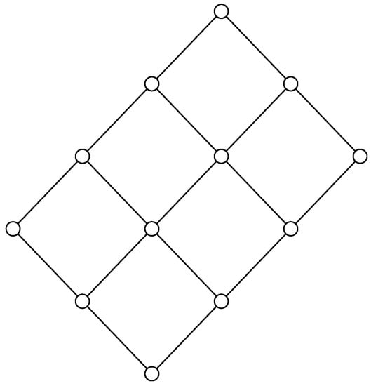 Our construction actually tells us more. If the lattice is distributive, it is glued together with blocks that are either equivalent to 2 or to the lattice Therefore, the lattice is a sublattice of a product of two chains, as illustrated in Figure 5. This result was first proven by Dilworth []. Other characterizations of planar distributive lattices can be found in the literature []. Since the extreme polymatroid functions on the lattices 2 and the lattice only take the values zero and one, the same is true for any planar distributive lattice.