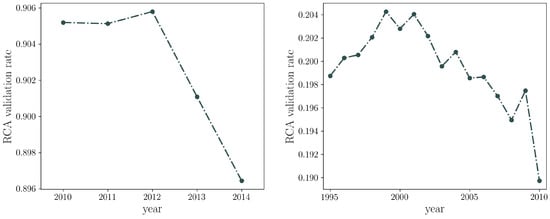 We filter out small firms in the CFP and small countries in the WTW, since they would bring very little information. In the CFP, we removed firms with a total yearly export volume lower than current USD (results do not change upon varying such a threshold). In addition, a Revealed Comparative Advantage (RCA) [15] threshold is applied. This procedure, which is standard in the analysis of international trade, consists in comparing, for every firm/country, the share of each export product value with the global (i.e., over the entire dataset) analogous. In formulas, if is the value of the export of the firm/country i for the product p, the RCA reads: