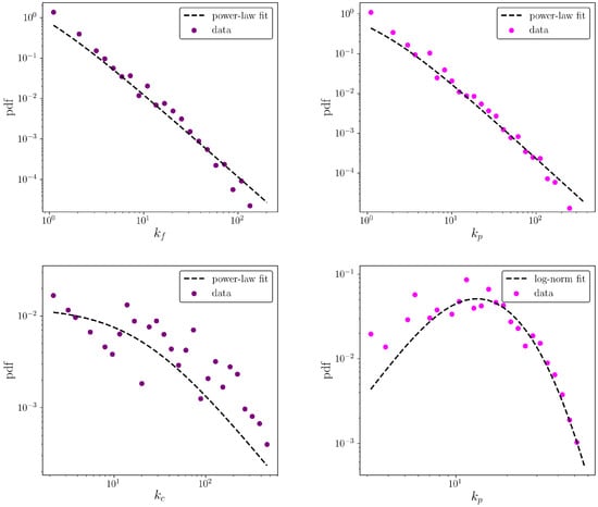 The evidence that diversifying is much more difficult for firms than for countries, in turn leading to little competition at the Colombian, national scale, also affects the performance of the FiCo algorithm in providing information about the “quality” of firms and products. Indeed, the FiCo algorithm takes advantage of the triangular shape of the biadjacency matrix. Indeed, it is able to go beyond the degree sequence and highlight those countries that are able to export items that only countries with similar factor endowments and technological capabilities are able to export. In the case of the CFP, there is another crucial point, which is the strong bipartite community structure. Even going beyond the degree sequence, still the community structure is not taken into account. Because of this, the predictions of the FiCo algorithm are going to be weaker on the CFP, with respect to those on the WTW. This is particularly evident when comparing the correlation between the firms’ degree and fitness with that of countries degree and fitness (and analogously for what concerns the products—see Figure 9).