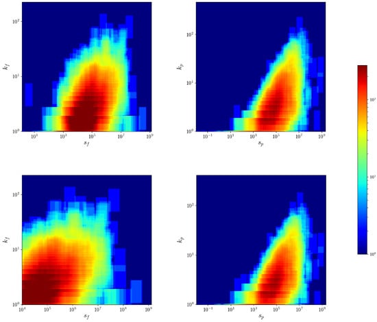 Degree vs. strength heatmap for the firms (left panel) and products (right panel) of the CFP network, after (top panel) and before (bottom panel) applying the threshold at USD. The heatmaps were obtained counting the number of points falling in sliding windows in log-log scale, and the color goes from blue to red as the density of points increases. The Spearman coefficient, computed on the thresholded dataset, is around 0.65 for products and 0.40 for firms. In the WTW case, it rises to 0.90 for countries and 0.73 for products.