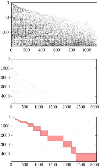 The FiCo algorithm is also able to highlight the “triangularity” of the biadjacency matrix describing a given system [41]: as Figure 5 shows, if rows are re-ordered by fitness and columns by complexity, the non-zero entries of the biadjacency matrix appear as “packed” together. When considering the WTW this becomes particularly evident, as the top panel of Figure 5 shows; analogously, when the FiCo algorithm is applied to the Colombian national export dataset, a triangular structure is revealed as well, as shown in the central panel of Figure 5 [42,43].