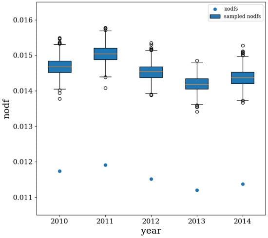 The analysis of nestedness (here we adopted the so-called NODF, i.e., Nestedness metric based on Overlap and Decreasing Fill [45]) allows the picture provided by the FiCo algorithm to be further refined. As Figure 6 shows, the z-score of nestedness is steadily negative across our temporal snapshots, i.e., : in other words, the observed CFP network configurations are significantly less nested than expected, a result that confirms our previous finding concerning the (bipartite) block-structure of the system under analysis. This result further points out that constraining the nodes degrees leads to enforcing some kind of nestedness as well, whose value is (significantly) larger than the observed one.