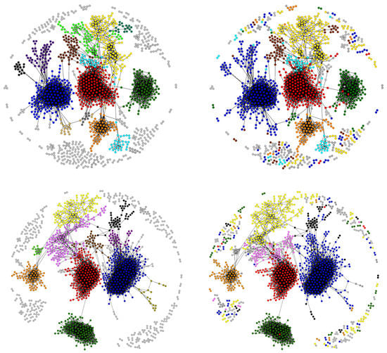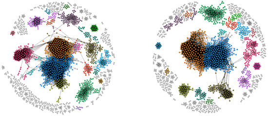 - Blondel, V.D.; Guillaume, J.-L.; Lambiotte, R.; Lefebvre, E. Fast unfolding of communities in large networks. J. Stat. Mech. Theory Exp. 2008, 2008, P10008. [Google Scholar] [CrossRef]