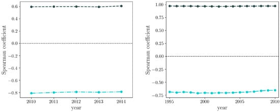 Evolution of the Spearman correlation coefficient between the degree of Colombian firms and their fitness values (dark green, dashed, left panel) and between products degree and complexity values (light green, dot-dashed, left panel). As a comparison, the Spearman correlation coefficient between the degree of countries and their fitness values (dark green, dashed, right panel) and between products degree and complexity values (light green, dot-dashed, right panel) is shown.