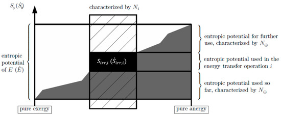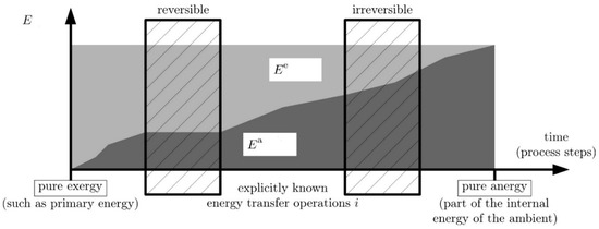 The initial energy in progressive times can either be left as it is or it can undergo consecutive energy transfer operations. During such a transfer operation, it will be partly and further devaluated (assuming transfer operations have already occurred) when the transfer operation is irreversible. This devaluation manifests itself in a (further) decrease of the exergy part in . Only when a transfer operation would be reversible would not decrease further. In Figure 1, two energy transfer operations are assumed to be explicitly known (one reversible, one irreversible). Before, between, and after these two operations, the energy undergoes further—yet not explicitly known—transfer operations. Finally, the energy is part of the ambient internal energy and then, as per definition, becomes 100% anergy.