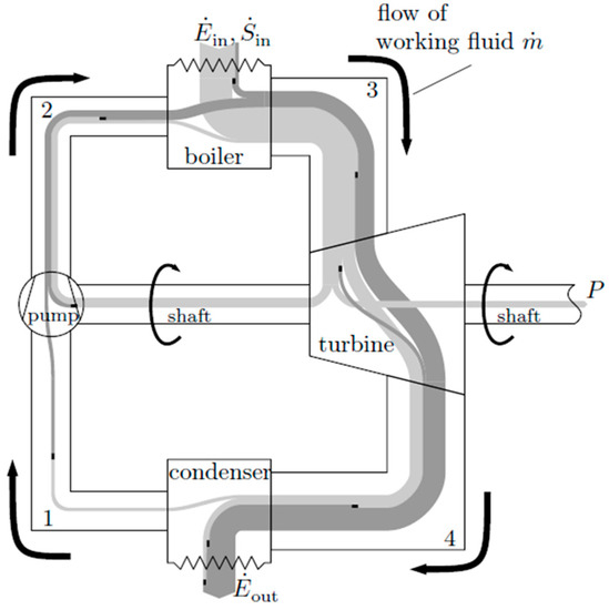 In Figure 3, a schematic diagram of the energy transfer operations in a steam power cycle is shown. The process as a whole is characterized and assessed by the four transfer components—pump (p), boiler (b), turbine (t), condenser (c)—and their performance. For simplicity, the exergy losses in the pipes are assigned to the components between the corresponding interfaces 1 to 4; those in the ambient are assumed to be part of the condenser exergy losses. In Reference [14], it is shown how this concept can be applied to gas turbine loss considerations.