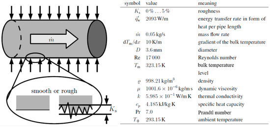 With this example, a very detailed analysis will be given about the heat transfer performance on the cold side of a heat exchanger. Here, a mass flow rate is heated by a constant energy transfer in the form of a constant heat flux per pipe length such that there is a constant gradient in bulk temperature . The question to be addressed is whether a rough wall might perform better than a smooth wall and to determine the degree of roughness that performs best in this case. The idea behind this question is that a better mixing of the fluid by wall roughness may decrease the exergy loss due to heat conduction such that it outweighs the increase of exergy loss due to increased frictional losses.