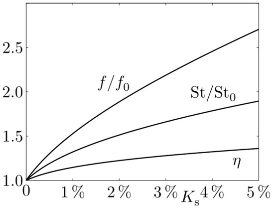 Roughness effects at the cold side of the heat exchanger, see Figure 4, in terms of , St, and . Figure adopted from [11].