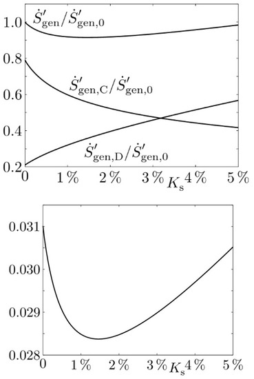 Figure 6(top) shows the influence of wall roughness on the single contributions and and on their sum . For a smooth wall, the entropy generation due to dissipation is appreciably smaller than that due to heat transfer. However, this is no longer true for increasing wall roughness. In accordance with the physics of the problem increases while is reduced. Because these effects are antipodal, the sum may have an extremum, which is a minimum at , as can be seen in Figure 6(bottom). Very different from the results given by , a distinct optimum appears here as a result of two counteracting effects with a clear physical interpretation in terms of lost exergy.
