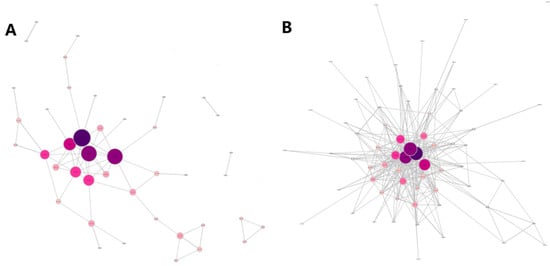 DCC-Threshold networks relative to: (A) the lowest network density on 20 April 2015; and (B) the highest network density on 8 January 2016.