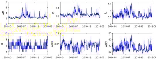 where ; denotes a variable of diameter; denotes a variable of average closeness centrality; represents a variable of average degree or average clustering coefficient, denotes a variable of average betweenness centrality or average path length; is a 6 × 1 coefficient vector. All estimations were conducted over the period of 29 January 2014 to 14 June 2018.