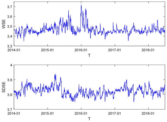 Figure 3 displays the dynamic fluctuations of the WSE and SDSE series of the daily DCC–Threshold networks during the sample period. The figure shows that the variations of the two network entropy indices did not fluctuate in accordance. The fluctuation trend of WSE seemed to be similar to that of the network average degree, and big peaks appeared during the period of the stock market disaster, while the bottom panel showed that big peaks appeared at the beginning of the turmoil period in SDSE, with the curve varying around a more stable mean level. The last two rows of Table 2 report the descriptive statistics of WSE and SDSE. It is shown that the mean level of SDSE was higher than that of WSE. Assuming the network is homogeneous, the entropy value is 4.3820. The maximum values of WSE and SDSE were 3.7183 and 3.9384, respectively, suggesting that daily GEM networks were always heterogeneous over the tested period. Finally, the significant results for ADF tests indicate that the two series of network entropy were both stationary.