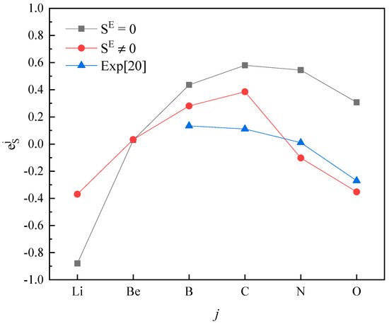 Plotting calculated values (for S E = 0 and S E 0 ) and experimental values according to incremental order of elements in each period of the periodic table, one can see the same trends among them (Figure 1, Figure 2, Figure 3, Figure 4 and Figure 5). Our results, however, differ from those by Silva [10], who showed the experimental e O i ( ε O j ) increases linearly with increasing atomic number. In addition, it’s obvious (Figure 1, Figure 2, Figure 3, Figure 4 and Figure 5) that a better agreement is achieved when S E 0 (case 1) between theoretical values and experimental ones. Thus, theoretically, considering the excess entropy is more favorable.