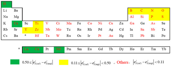 To establish our calculation method, we noticed that the precision of the calculated results heavily relies on the Miedema model and the geometric model. The Miedema model is one of the most successful models to predict the formation enthalpy of alloys. It may be owing to that more physical quantities such as electronegativity, electron density, and molar volume than other models like the Pauling electronegativity model (only electronegativity considered) have been considered [24]. However, it’s not sufficient when the constituents’ physical properties are of large differences, some minor contribution terms which are usually neglected now can’t be ignored. In the Fe-S-j system, e S j is not only dependent on the physical property differences between sulphur and elements j, but also on the differences between elements j and iron as well as between iron and sulphur. Consequence, the elements j with large deviations between calculated and experimental values | e S ( exp ) j e S ( cal ) j | are mainly located in the periodic table far from the Fe group, especially in the left side (Figure 6), for example, the elements Ca, Ce, La, Y, Zr, etc. Moreover, the elements H, B, C, N, P, etc. are dealt with in Miedema’s model in a complicated way, and in current model, this may be also need some appropriate corrections to be made. Aiming at the deviation of the Miedema’s model, it can be improved by adding some terms such as a volume correction term [30] and an improved atomic size term [31], as well as by modifying the Miedema parameters of a specified element [32].