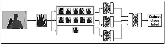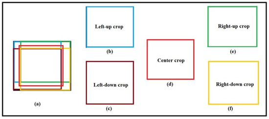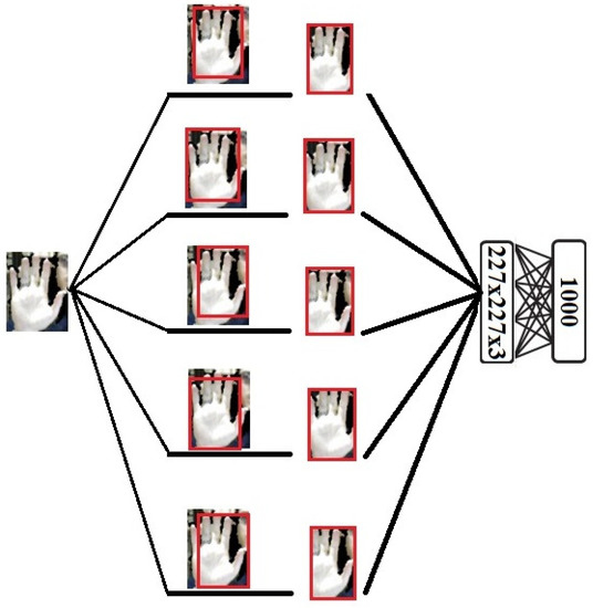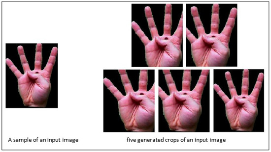 To increase the accuracy of the proposed method in recognizing the hand sign language under different situations, different crops of input images are used, as Figure 5 shows. Using different crops is helpful for increasing the accuracy of the model in recognizing input images in situations where some parts of the images do not exist or have been destroyed. In addition, by using these crops, the size of the dataset is increased, being beneficial for deep learning approaches. The proposed method is evaluated by using different numbers of crops to select the suitable number of crops. Furthermore, the proposed method is trained not only on the input images without any crops but also on the cropped images. A sample generating different crops of an image is shown in Figure 6.