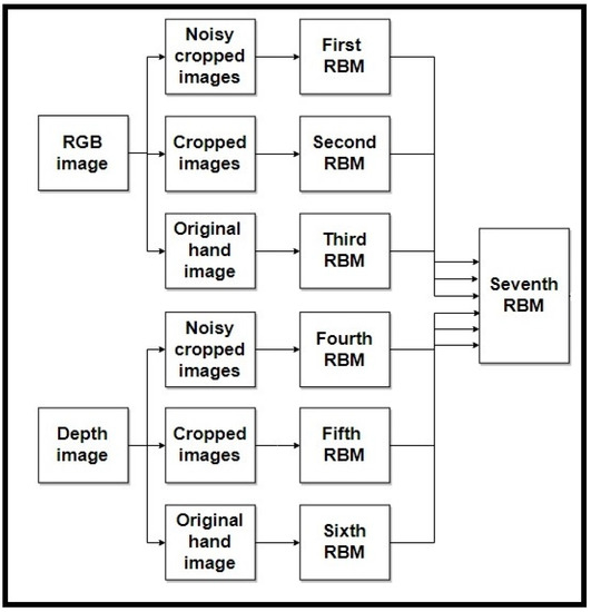 - Enter into the RBM: In the proposed model, we use not only two modalities, RGB and Depth, but also three forms of input image: an original input image, a five cropped input image, and a five noisy cropped input image. For each model, we use these three forms of input image and send them to the RBM. Six RBMs are used in this step as follows:First RBM: The inputs of the first RBM are five RGB noisy cropped images. Each of these five noisy crops is separately input to the RBM.Second RBM: Five crops of RGB input image are the inputs of the second RBM.Third RBM: Only the original detected hand of the RGB input image is considered as the input of third RBM.Fourth RBM: Five depth noisy cropped images are separately sent to the fourth RBM.Fifth RBM: The inputs of the fifth RBM are five depth cropped images.Sixth RBM: The original depth detected hand is considered as the input of the sixth RBM.