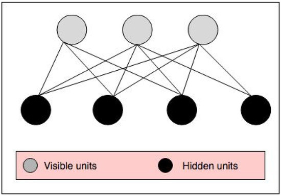 RBM is an energy-based model that is shown via an undirected graph, as illustrated in Figure 8. RBM is used as a generative model in different types of data and applications to approximate data distribution. The RBM graph contains two layers, namely visible and hidden units. While the units of each layer are independent of each other, they are conditioned on the units of the other layer. RBM can be trained by using the Contrastive Divergence (CD) learning algorithm. To acquire a suitable estimator of the log-likelihood gradient in RBM, Gibbs sampling is used. Suitable adjustment of the parameters of RBM, such as the learning rate, the momentum, the initial values of the weights, and the number of hidden units, plays a very important role in the convergence of the model [21,22].