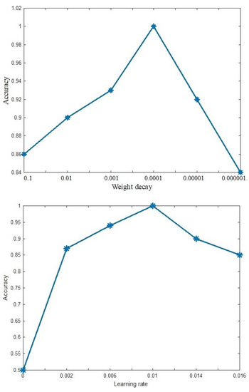 Changing some parameters in the proposed method led to different accuracies in the method. Suitable values for the parameters are selected after testing different values for these parameters. Figure 12 shows the effect of changing the learning rate and weight decay parameters in the proposed method. After selecting the best values of the parameters, we fixed and tested the model.